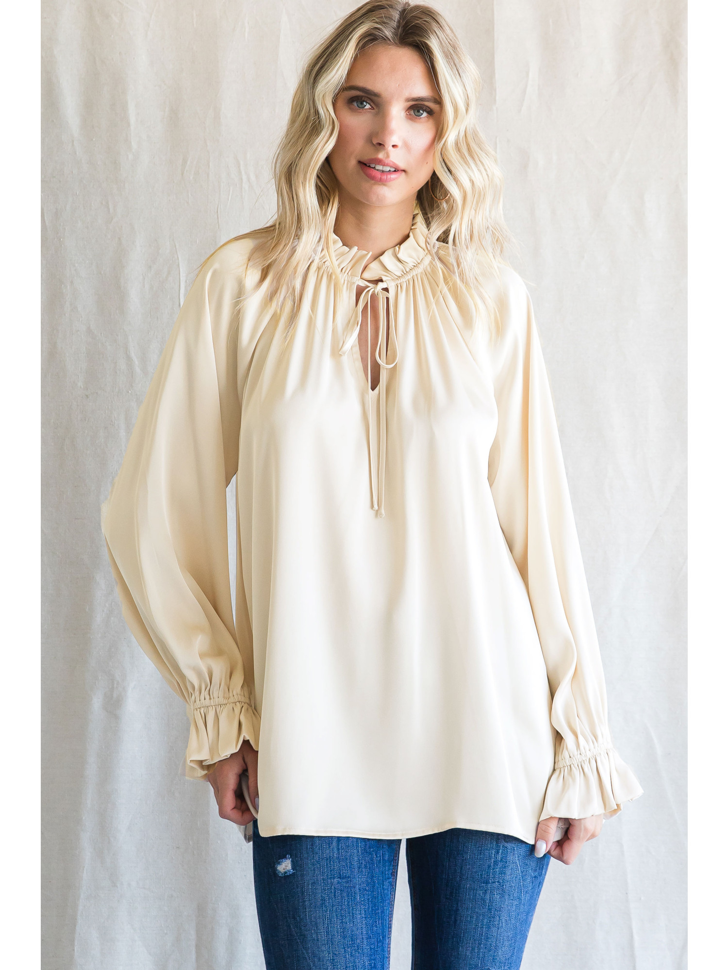 CHAMPAGNE TOP WITH FRILLED NECK AND SLEEVES
