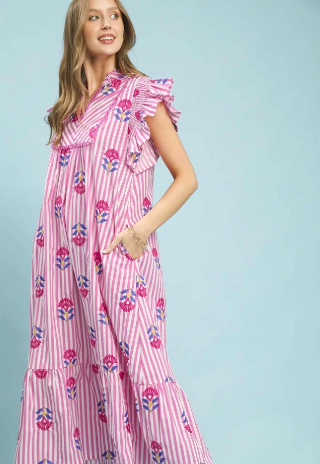 PINK FLORAL AND STRIPED DRESS WITH POCKETS