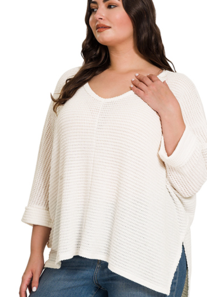 PLUS SIZE 3/4 SLEEVE V-NECK JACQUARD SWEATER