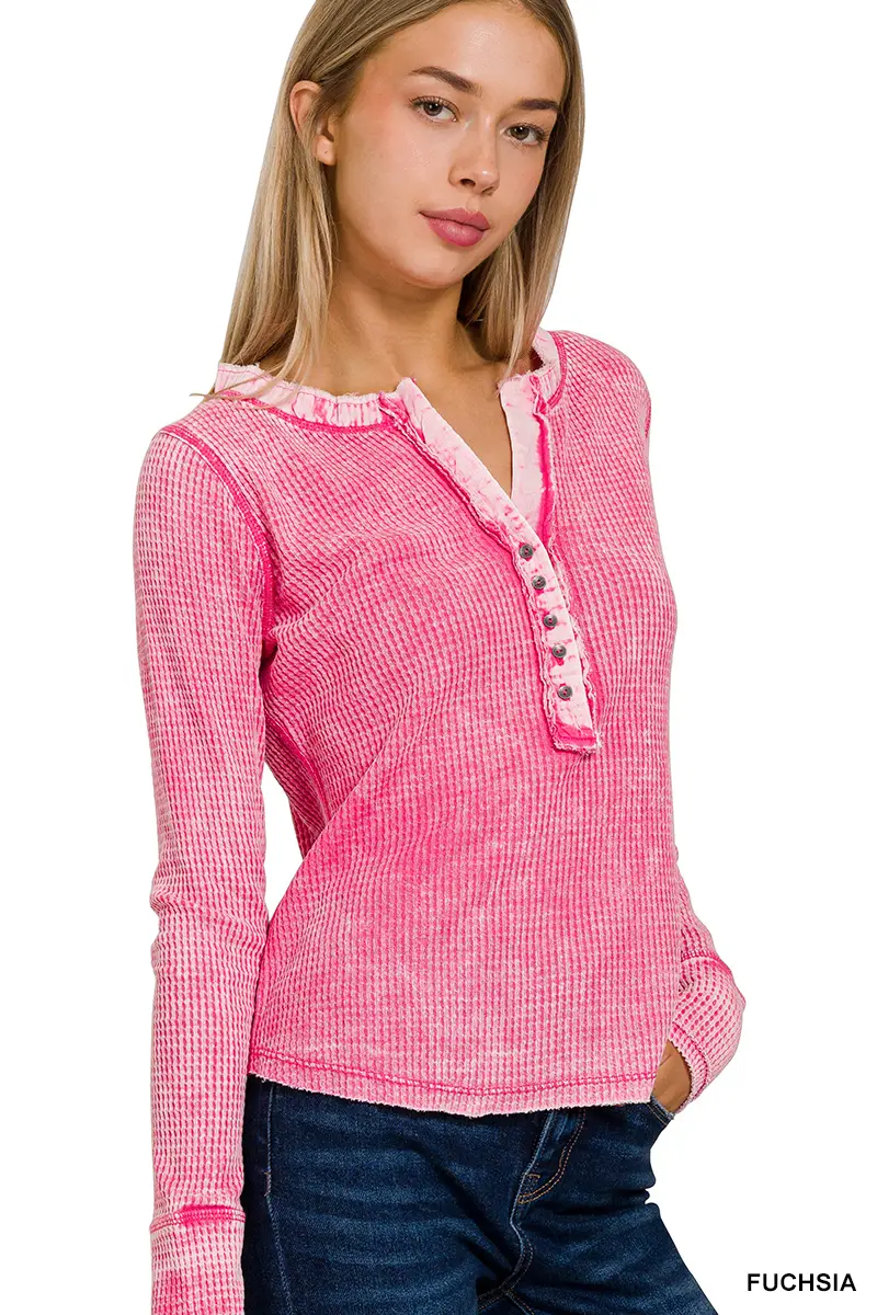 Washed Baby Waffle Henley Neckline Long Sleeve Top